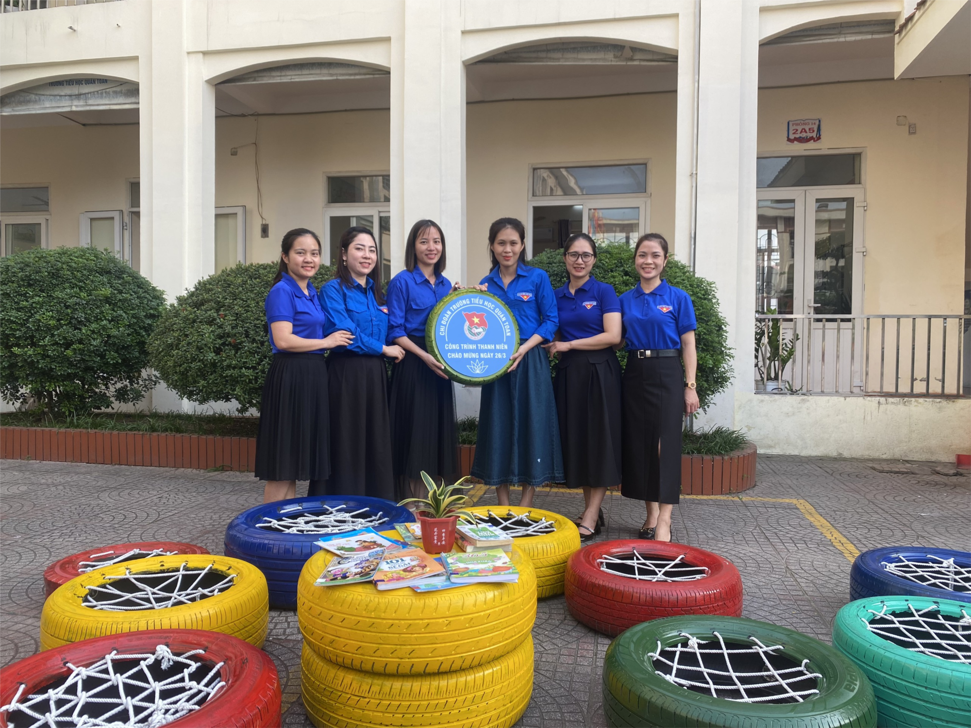 Thanh niên trường Tiểu học Quán Toan đã thực hiện làm bàn ghế bằng lốp xe ô tô tái sử dụng kết hợp với đan dây cho học sinh nghỉ ngơi, đọc sách ở ngoài trời hoặc trong