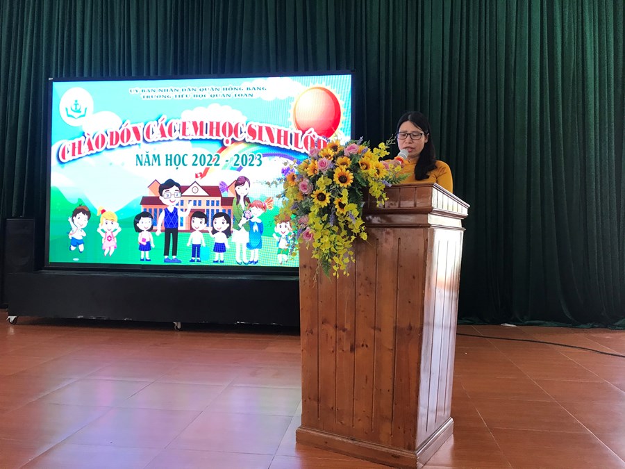 Cô giáo Hiệu trưởng Nguyễn Thị Hạnh đọc diễn văn chào đón các em học sinh lớp 1 và tặng hoa chúc mừng cho các cô giáo chủ nhiệm lớp 1 năm học 2022 - 2023. Sau khi dự buổi chào đón học sinh lớp 1 tựu trường các em học sinh lớp 1 trở lại phòng học của lớp mình để tham gia buổi học đầu tiên của các em tại ngôi trường tiểu học Quán Toan thân yêu sẽ gắn bó với các em trong 5 năm tiểu học.