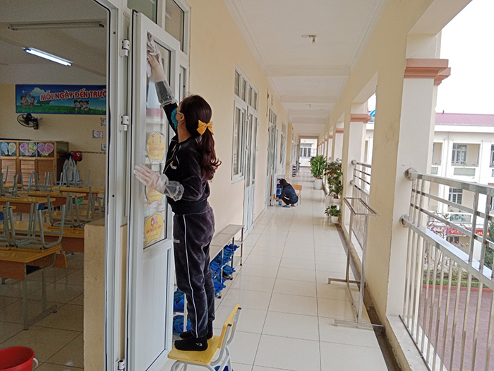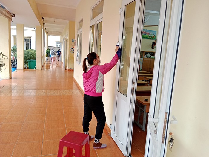 Cán bộ, giáo viên, nhân viên nhà trường thực hiện tổng vệ sinh các phòng học, lớp học, các phòng chức năng, nhà bếp, khu nhà ăn bán trú… nhằm đảm bảo an toàn phòng chống dịch khi đón các em trở lại trường học.
