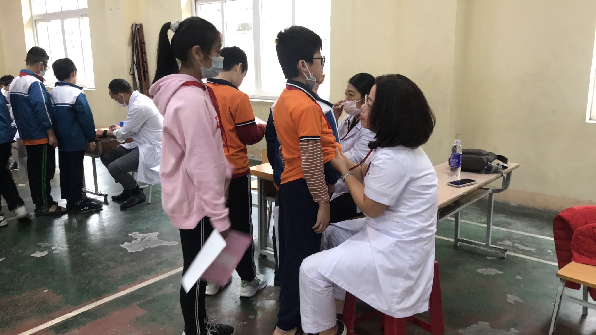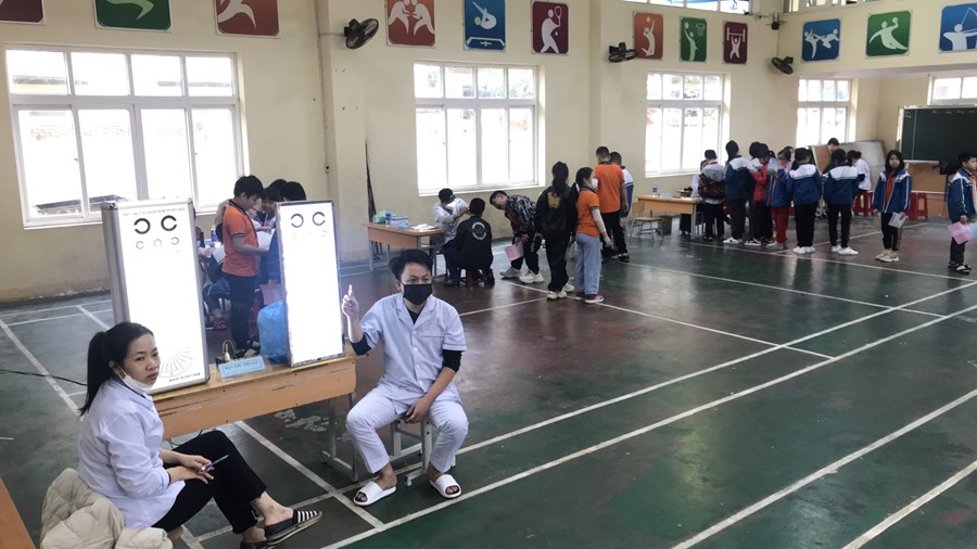 Hôm nay, ngày 20 tháng 10 năm 2022 các y bác sĩ bệnh viện Đa khoa quận Hồng Bàng thực hiện khám sức khoẻ cho các em học sinh trường Tiểu học Quán Toan tại khu nhà Đa năng của nhà trường với các nội dung khám như: Cân đo chiều cao, đo huyết áp, khám nội ngoại da liễu, tai mũi họng, răng hàm mặt, mắt.