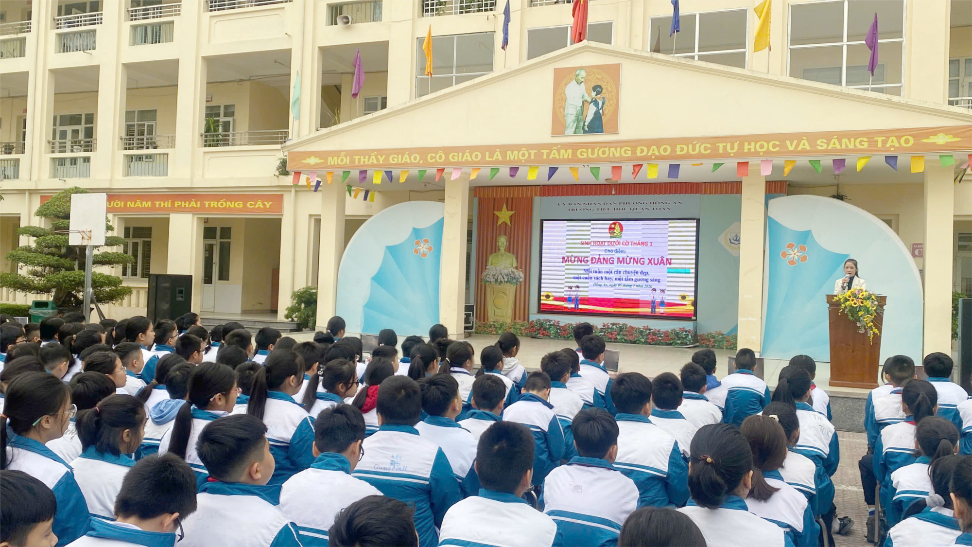 Trong buổi sinh hoạt dưới cờ tháng 1/2026 cô giáo Hiệu trưởng Nguyễn Thị