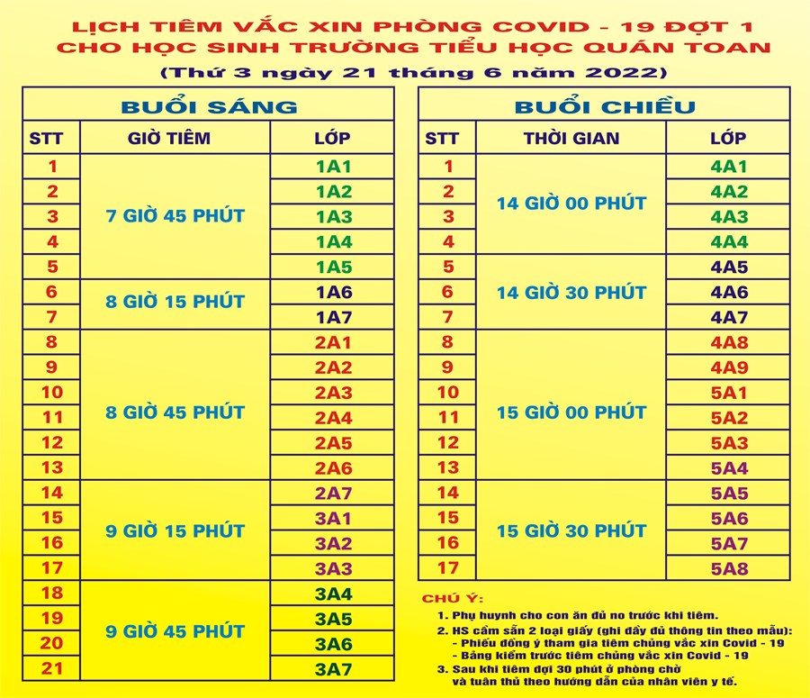 Thứ 3 ngày 21 tháng 6 năm 2022 Trạm y tế phối hợp với nhà trường tổ chức tiêm vắc xin phòng Covid-19 cho học sinh trường tiểu học Quán Toan.