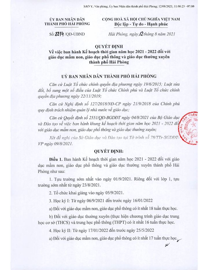UBND thành phố vừa ban hành Quyết định số 2274/QĐ-UBND ngày 12/8/2021 về việc ban hành Kế hoạch thời gian năm học 2021 - 2022 đối với giáo dục mầm non, giáo dục phổ thông và giáo dục thường xuyên thành phố Hải Phòng.