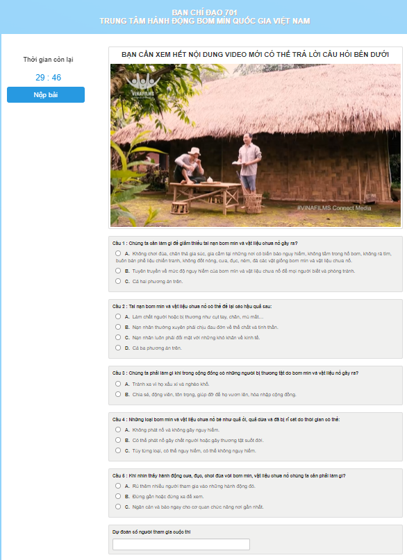Phát huy thành công của các cuộc thi trực tuyến 2 năm trước, năm nay Ban tổ chức đã có sự đổi mới trong phương thức xây dựng bộ câu hỏi thi. Theo đó, thí sinh tham gia thi sẽ được xem một tiểu phẩm vui chứa các thông điệp truyền thông về cách phòng tránh tai nạn bom mìn sau đó sẽ trả lời 5 câu hỏi trắc nghiệm liên quan đến các thông điệp vừa nêu trong Video clip.